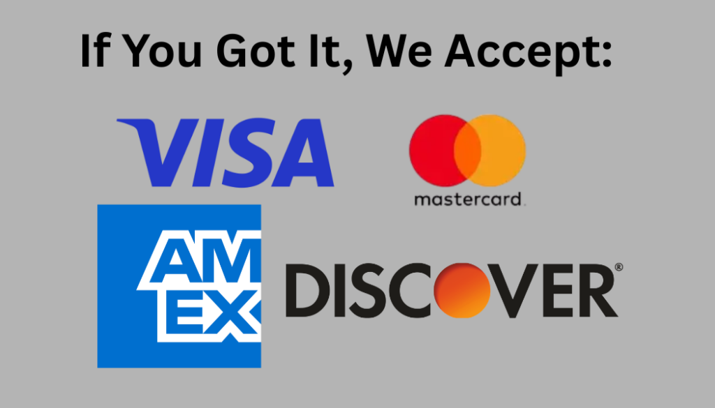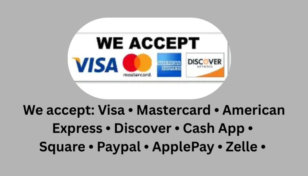 Accepted payments: MasterCard, Visa, American Express, Discover, ApplyPay, Square, Zelle, Stripe, PayPal, Cash or CashApp. Checks are NOT accepted. For the safety of CherryGo Team Members, cashless transactions are preferred.